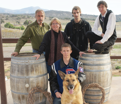 (Left to right) Victor, Beth, Karl, Austin and Mitchell Edwards, and Doc. This is our Edwards Family Christmas photo (2012) on our tasting patio, with a partial view of our 3-acre vineyard and the Cuyamaca mountains.