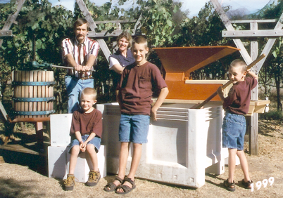 (Left to right) Victor, Mitchell, Beth, Karl and Austin Edwards. This is our Edwards Family Christmas photo (1999) at our first home in Ramona, with our original winemaking equipment and first vineyard.
